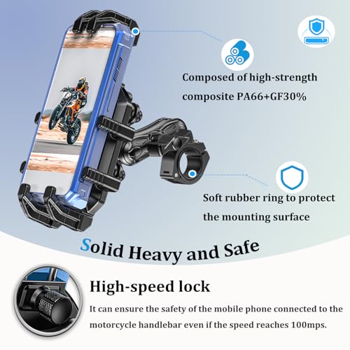Rust and Safe: The main body of this motorcycle phone mount is composed of high-strength composite PA66+GF30%. It will not fade outdoors when exposed to the sun, and it will prevent rust in rainy and snowy weather, and will keep the texture as new for a long time.