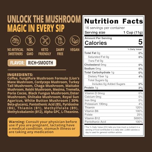 Experience the Nutrient-Rich Mushroom Coffee: Enjoy Dark roast Arabica coffee infused with extracts from 14 functional mushrooms, including Reishi, Turkey Tail, Lion’s Mane, Chaga, Cordyceps, Maitake, Poria Cocos, Black Fungus, Mesima, Black Fungus, Oster Mushroom, Shiitake Mushroom, Royal sun agaricus, White button mushroom and Tremella. This blend provides clean energy, mental focus, and immune support.