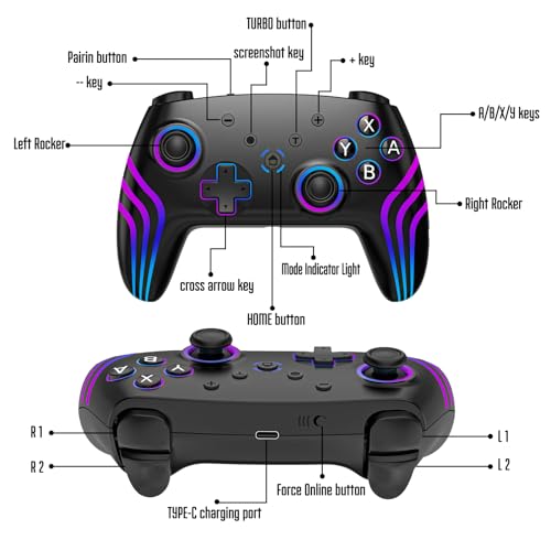 Specification: MYSTILUCK Wireless Pro Controller for Switch/Switch 2/Lite/OLED/PC, Gamepad with 7 Color-Changing RGB Lighting/Dual Vibration/6-Axis Gyroscope/Turbo, Ergonomically Designed Precise Joystick