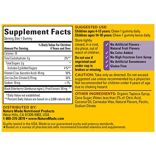 Nature Made Kids First Elderberry Gummies are dietary supplements that offer delicious immune system support for kids with Vitamin C and Zinc. Sourced from high quality ingredients, these Nature Made Elderberry gummies with Zinc and Vitamin C for kids are gluten free and contain no artificial flavors, no color added, no high fructose corn syrup and no artificial sweeteners. Like other berries, fresh Elderberries contain anthocyanins, which are known to have antioxidant properties (1). Vitamin C is an antioxidant, and Zinc is an essential mineral and immune support nutrient. These Elderberry supplements provide 50mg of Black Elderberry extract along with 45mg of Vitamin C and 3.75mg of Zinc per serving to help support your child’s immune health. Nature Made Elderberry with Vitamin C and Zinc provides Black Elderberry gummies for kids in a delicious raspberry flavor. Children ages 4-13 years, chew 1 gummy daily. Children ages 14-18 years, chew 1 gummy twice daily. Nature Made supplements are quality you can trust. (1) Clifford, M. Review Anthocyanins – Nature, Occurrence and Dietary Burden. J Sci Food Agric 80:1063±1072 (2000). *Based on a survey of pharmacists who recommend branded vitamins and supplements.