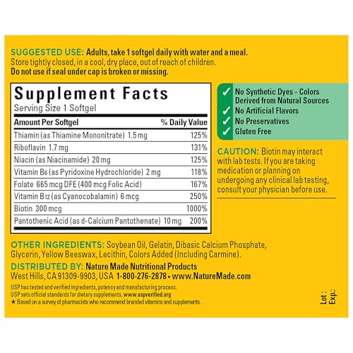 Nature Made Super B (1)Energy Complex Softgels offer certain B vitamins that help support brain cell function. These Nature Made Vitamin B Complex softgels are gluten free and contain no artificial flavors, no synthetic dyes, and no preservatives. This Nature Made Super B Energy Complex supplement also offers energy metabolism support(1). Nature Made Super B Complex is a dietary supplement that can help you increase your intake of B vitamin nutrients that may be missing from your diet. This Nature Made Super B Energy Complex provides all 8 essential B vitamins: thiamin (B1), riboflavin (B2), niacin (B3), pantothenic acid (B5), B6 (pyridoxine), biotin (B7), folic acid (B9), and B12 (cyanocobalamin). Super B vitamin cellular energy supplements; adults take one softgel daily with water and a meal to help absorption. Nature Made supplements are quality you can trust. USP has tested and verified ingredients, potency and manufacturing process. USP sets official standards for dietary supplements. Visit the USP verified website for more information. (1)Helps convert food into cellular energy. *Based on a survey of pharmacists who recommend branded vitamins and supplements