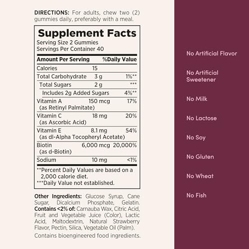 Specification: Nature’s Bounty Optimal Solutions Hair, Skin & Nails Vitamin Gummies with Biotin, 2500 mcg, Strawberry, 80 Count, 40 Total Servings