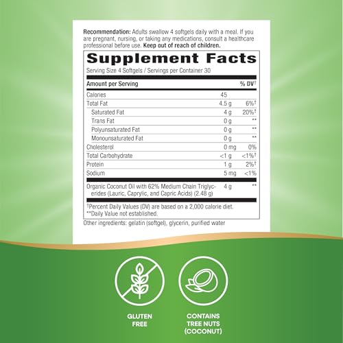 Specification: Nature’s Way Coconut Oil, 62% MCTs(1), Hexane Free, 120 Softgels (Packaging May Vary)