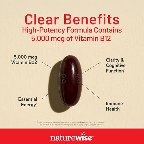 NatureWise Vitamin B12 5000 mcg – Extra Strength – Supplement for Supporting Energy Levels, Mental Clarity, Nervous System Health – Easy-to-Swallow, Soy and Gluten-Free, Non-GMO – 60 Softgels