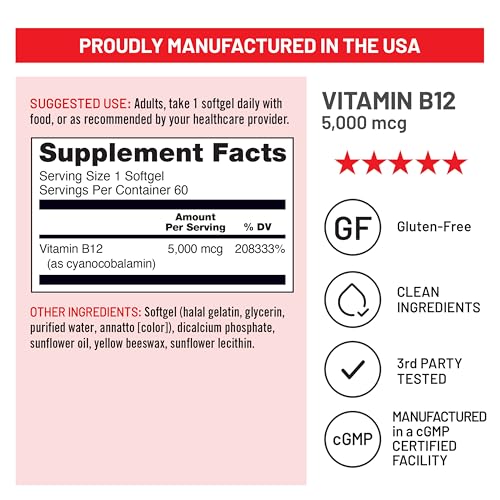 5000 MCG VITAMIN B12: Every easy-to-swallow softgel delivers 5000 mcg of Vitamin B12.