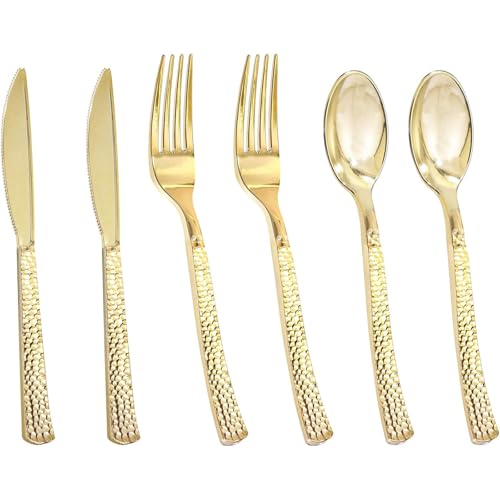 Specification: Nervure 300PCS Gold Hammered Plastic Silverware – Heavy Duty Plastic Cutlery – Gold Disposable Utensils Includes 100 Forks, 100 Knives, 100 Spoons Perfect for Wedding & Party