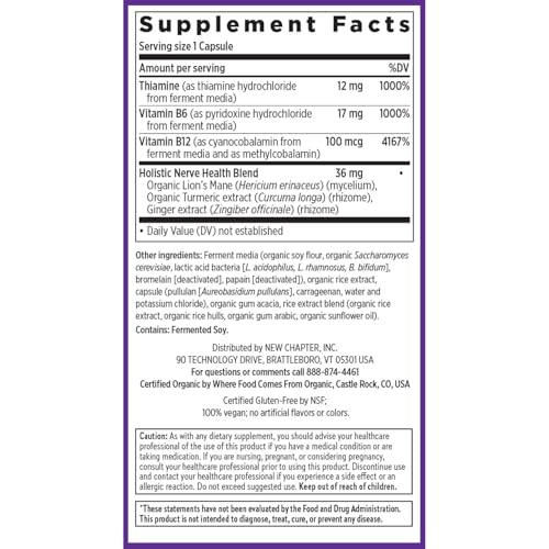 For head-to-toe benefits you can feel, this pioneering holistic blend delivers nerve support with the right amounts of Vitamins B1, B6 & B12.* New Chapter®’s fermented B Vitamins work to generate energy for your nerves, support healthy nerve-to-nerve transmission, and help protect your nerve cells.* Formulated for absorption with whole-food fermented nutrients, our one-daily vegan capsules are enhanced with a complementary Holistic Nerve Health blend of superfood botanicals including Turmeric, Ginger, and Lion’s Mane mushroom. That’s wellness, well done. *These statements have not been evaluated by the Food and Drug Administration. This product is not intended to diagnose, treat, cure, or prevent any disease.