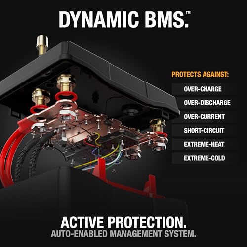 DYNAMIC BMS — Built-in battery management system ensures safety and reliability with bidirectional cell balancing and protection from overcharge, overdischarge, short circuits, and more – plus active thermal monitoring with no resets required.