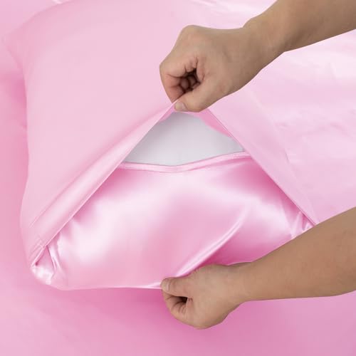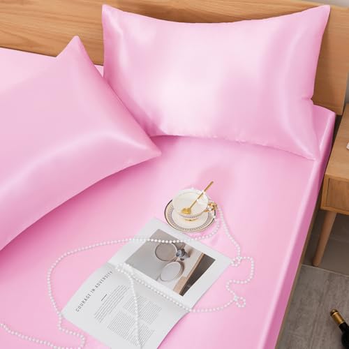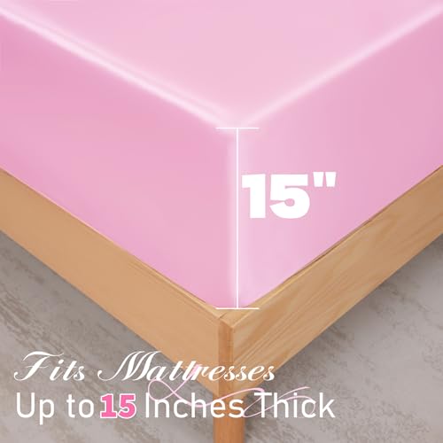 Specification: NSGZ 3 Pcs Satin Fitted Sheet and Pillowcase Set, Queen Silky Bottom Bedsheet Fit up to 15 Inch Deep Pocket Mattress, Pink Soft Satin Bedding Includes 1 Fitted Sheet and 2 Pillowcases