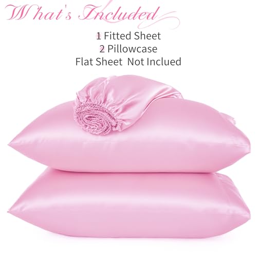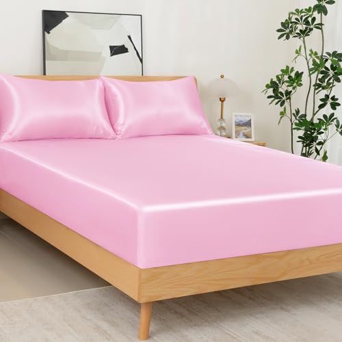 NSGZ 3 Pcs Satin Fitted Sheet and Pillowcase Set, Queen Silky Bottom Bedsheet Fit up to 15 Inch Deep Pocket Mattress, Pink Soft Satin Bedding Includes 1 Fitted Sheet and 2 Pillowcases