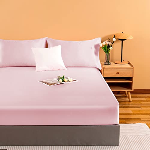NSGZ Satin Fitted Sheet Twin, Single Silky Fitted Sheet Only Soft Deep Pocket Bottom Bed Sheets, Wrinkle Free & Fade Resistant & Breathable Bottom Sheets- Pink