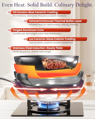 2025 NEW & UPGRADED G11 DURALON BLUE CERAMIC – Experience the all-natural, healthy G11 Duralon Blue ceramic coating with advanced sol-gel nano technology. It boosts 30% better non-stick performance and is more scratch resistant than G10. Non-toxic and free of harmful substances even at higher temperatures, it ensures a safe, superior cooking experience.