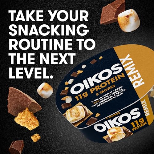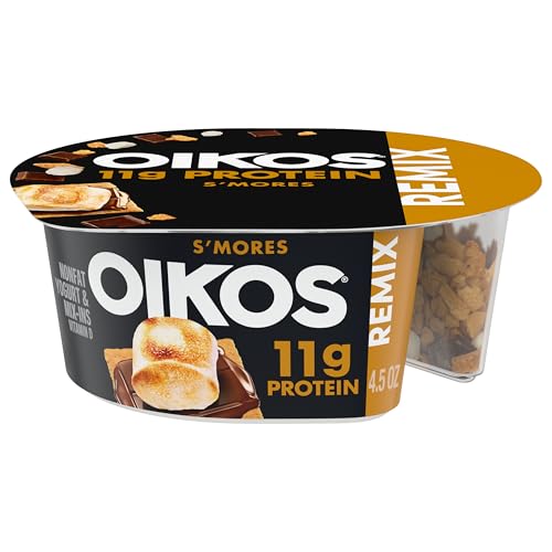 Specification: Oikos REMIX S’mores Vanilla Nonfat Greek Yogurt with Graham Cookies, Dark Chocolate and Toasted Marshmallow Bark Mix-Ins, Delicious High Protein Yogurt Snack With 11g of Protein, 4.5 OZ Cup