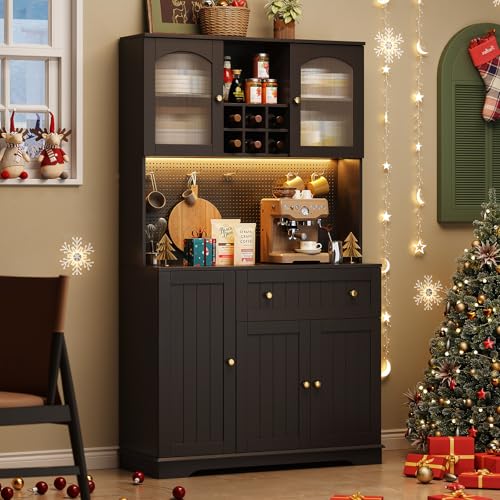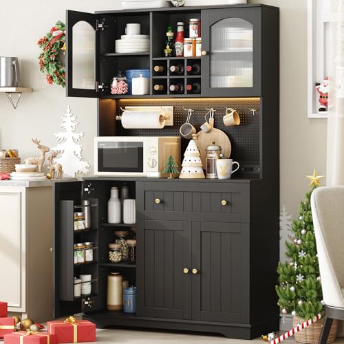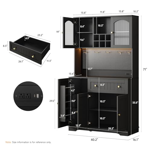 Specification: ONBRILL 71″ Kitchen Pantry Cabinet with Microwave Shelf & Door Shelves, Kitchen Hutch with Outlet & LED Light, Wood Pantry Storage with DIY Pegboard & 6 Hook, Modern Cabinet with Drawer & Wine Rack