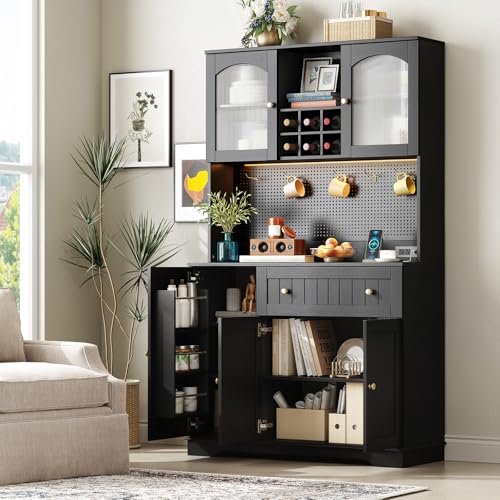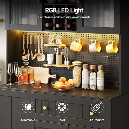KITCHEN PANTRY STORAGE CABINET: This kitchen pantry hutch cabinet features LED Lighting, a built-in charging station, a DIY pegboard with 6 hooks, and a removable wine rack. It comprises 5 doors and 1 drawer, 3 Door Shelves with adjustable shelves, and a removable wine rack. This pantry cabinet is an ideal addition to any home and meets your storage needs.
