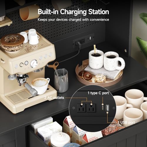 LED LIGHT & POWER OUTLET: The kitchen pantry storage cabinet features a brightness-adjustable LED light. Its various colors and flashing modes create a cozy ambiance. The pantry cabinet also has 2 AC outlets, 1 USB port, and 1 type C port, which conveniently charge your devices.