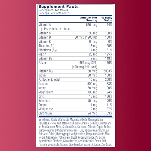 One A Day Proactive 65+ offers a wide variety of key nutrients in two convenient easy to take tablets. One A Day Proactive 65+ is a complete multivitamin specially formulated for men and women 65 years or older that contains key nutrients important for this age. This daily multivitamin contains key nutrients like Vitamins A, B6, B12, C, and D, Riboflavin, Thiamin, Niacin, Folic Acid, Biotin, Pantothenic Acid, Iodine, Magnesium, Selenium, Copper, Chromium, Calcium, Zinc, and Manganese. One A Day Proactive 65+ is formulated to support cell health, heart health(1), healthy blood pressure(2), bone health, and physical energy by helping convert food to fuel.* Adults over 65 should take two tablets daily, with food. One A Day Multivitamins can provide nutritional support that you and your family may need at every life stage. (1) Not a replacement for heart medications. (2) To help support blood pressure levels already within the normal range. *This statement has not been evaluated by the Food and Drug Administration. This product is not intended to diagnose, treat, cure, or prevent any disease.