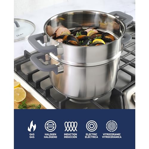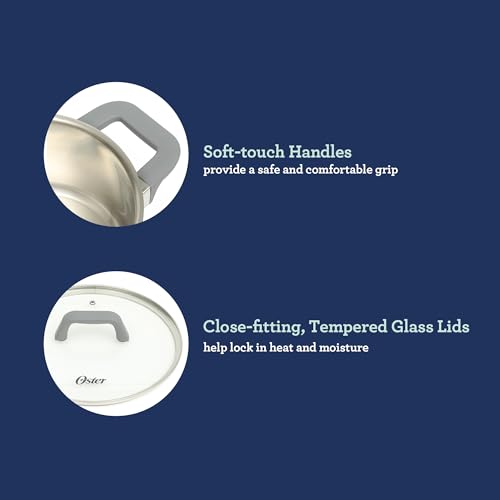 Whether a home chef needs to cook up a storm or put together a quick meal with 5 ingredients or less, the Oster™ Beauford Stainless Steel Cookware Set has the versatility and durability to deliver delicious results. These stainless steel pots and pans conduct heat and cook evenly – thanks to the encapsulated aluminum core – to serve the best and finestr flavors and texture every time. Plus, these pieces are easy to clean due to the brushed exterior finish that resists stains and scratches. Meanwhile, the non-reactive interior does not cause chemical reactions with food, making this cookware set the best kitchen equipment to make tomato- or citrus-based recipes. The soft-touch handles give a safe and comfortable grip, while the rivetless design means easier cleanup after every use. Not only does it offer a seamless look, but it also ensures that no stubborn residues or grime gets stuck in between the corners of each rivet head. The set also comes with flat, tempered glass lids that fit snugly to lock in heat and moisture while letting home cooks easily peek at simmering soups and stewing meat and potatoes. Best of all, the lids are shatter-resistant, and the whole set is dishwasher safe—so cleanup’s a snap.