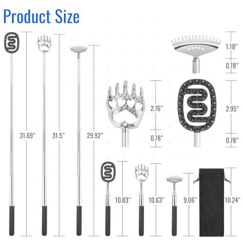 Always Got Your Back: A practical and thoughtful gift for Christmas, birthdays, or Valentine’s Day. The perfect stocking stuffer for dads, husbands, and sons—this back scratcher set is always ready to provide relief and show you care. Includes: 1 Telescoping Pole, 1 Dual-Sided Spike Head, 1 Stainless Steel Rake Head, 1 Metal Bear Claw Head, and 1 Storage Pouch.