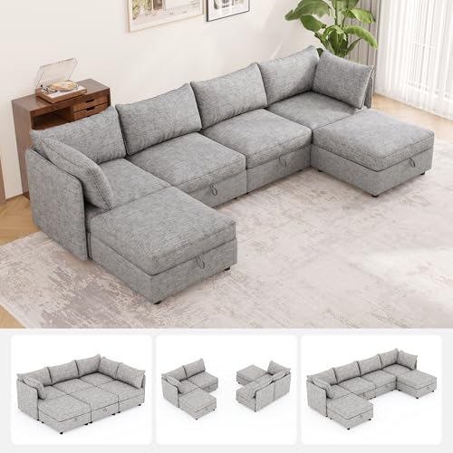 Oversized Modular 6 Seater Sofa with Removable Covers and Storage, Convertible U, L-Shaped and Sleeper Sectional, Modern Sectional Couch with Ottoman Chaise for Living Room, Bedroom, Apartment, Gray