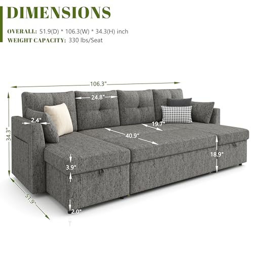 Specification: Oversized Sleeper Sofa Couch, 110 inch 2 in 1 Pullout Couch Bed with Double Storage Chaise, Sectional Sleeper Sofa Bed with Side Pocket for Living Room, Dark Grey