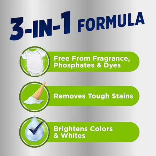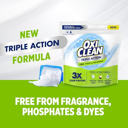 Power up stain fighting with no fragrances, or dyes with OxiClean Triple Action Free Versatile Stain Remover Powder. With 3X the stain fighters vs. the leading value detergent alone per load, use this super-powerful laundry additive with detergent to remove stubborn stains, whiten, and brighten every load. It tackles tough stains like oil, grease, coffee, wine, chocolate, ketchup, baby food, fruit juice, grass, mud, blood, ink and washable paint in machine-washable fabrics like bedding, towels, washable sneakers, and sports gear. This convenient, multi purpose OxiClean unscented stain remover has 101 laundry and cleaning uses around your home on soft and hard surfaces like grout, carpet, patio furniture and upholstery. It’s color-safe and powered by oxygen with no chlorine bleach, dyes or fragrances, and it works in standard and HE washers in all temperatures, even cold water. Packaged in a ship-friendly, resealable, leak-resistant pouch, use it with detergent before adding clothes, as a laundry pre-soak, or to clean and remove stains around your home. (See complete directions on label.). Extend the life of your favorite clothes with the original oxygen-powered laundry stain remover, the number-one stain remover additive brand in the USA (based on units sold).