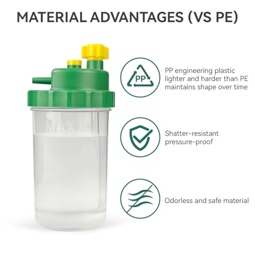 Material Selection: The oxygen humidifier bottle body is made of PP, compared to PE, the material is more safe and non-toxic. The lower density makes the cup lighter, the higher hardness makes it hard to break. This increases safety, reliability and effectiveness during your use of the device