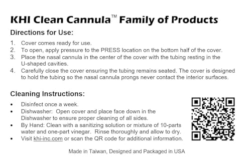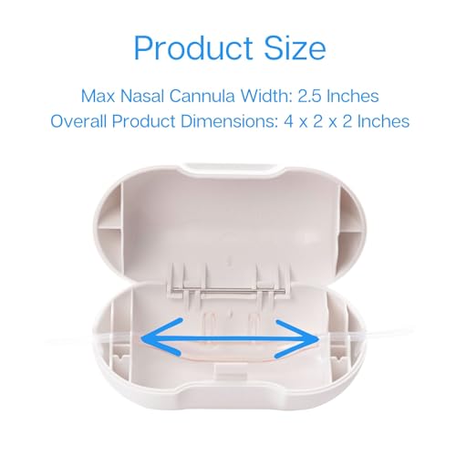 SIZE: Product is 4 x 2 x 2 inches in size. This innovative product helps to keep your favorite brand nasal cannula clean when not in use. Simply place any adult sized over-the-ear nasal cannula in this protective cover. The patented design keeps the cannula prongs from contacting any of the interior surfaces of the cover. The easy to open and close cover also saves you time and money by eliminating the need to constantly replace your nasal cannula. CLEANING: Product is dishwasher safe. It is recommended to be cleaned at least once a week. USE: This product is designed to work with all standard two prong over-the-ear adult nasal oxygen cannulas with nasal prongs and reservoir up to 2.5 Inches wide. US Patents: 10786639, 9731038, 8887919.