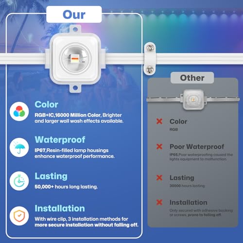 Variety Scene Mode Selection: You can choose from 73 scene modes to light up outdoor decor with our permanent outdoor lights. Furthermore, this outdoor LED RGB+IC lights are featured DIY modes, you can set different lighting effects for different occasion.
