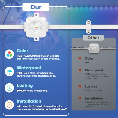 Specification: Permanent Outdoor Lights, Outdoor Christmas Lights, DIY RGB+IC Smart Eave Light with App Control, Support Alexa and Google Assistant, IP67 Waterproof, Outdoors Light for Christmas Decorations, 100FT
