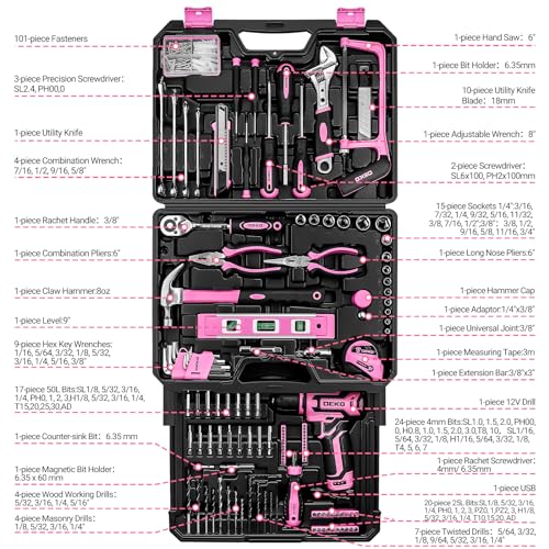 Specification: Pink Tool Kit Box Drill Set:DEKOPRO Home Mechanic Toolbox with 12V Power Cordless Drill Hand Repair Tools Sets Combo Kits Storage Organizer Drawer Case for Men & Women
