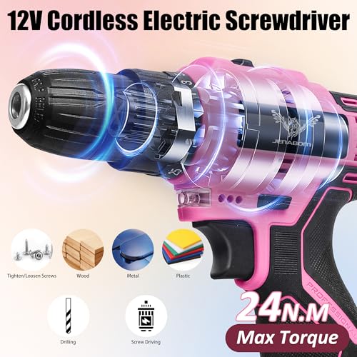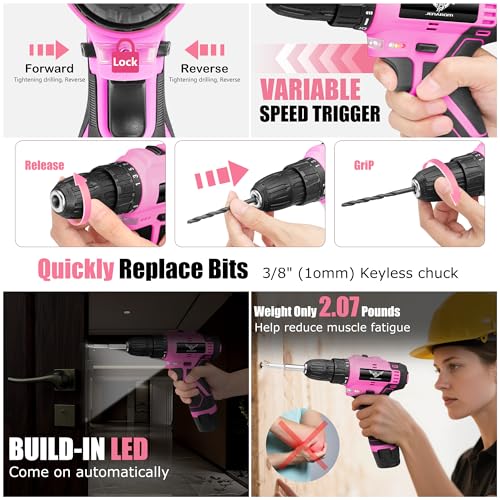 【Pink Cordless Drill with LED】The 12V tool kits can be used for drilling home repairs, furniture assembly, or garden projects, its cordless design allows unrestricted movement. Equiped with built-in LED light, it can be used in a dark environment