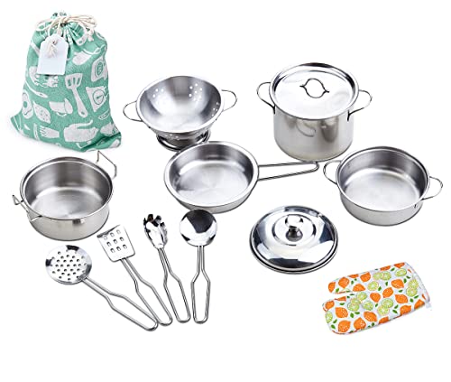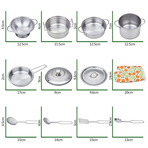 COMPLETE PRETEND KITCHEN COOKWARE SET: Includes 4 pots and pans with 2 covers, 4 cooking utensils, each 5”long. Pots and pans are 3.5” in diameter. This amazing 12-piece stainless steel pretend play kitchen set contains everything your little ones need!