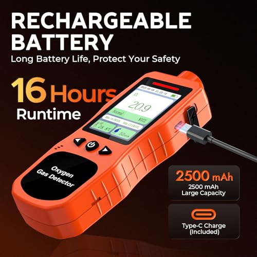 【Rechargeable Battery & Long-Lasting Life】Portable O2 air quality monitor with a 2500mAh built-in battery, offering up to 16 hours of continuous operation and Type-C charging. Automatic stores up to 180 alarm logs for easy O2 gas monitoring and safety analysis.