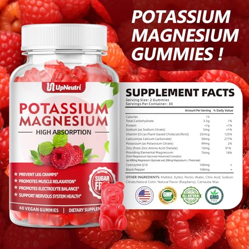 Specification: Potassium Magnesium Supplement Gummies for Adults Kids, Sugar-Free Potassium Citrate Gummies Supports Leg Cramps & Muscle & Heart Health, Vegan Magnesium Glycinate Gummies Raspberry Flavor 60 Cts