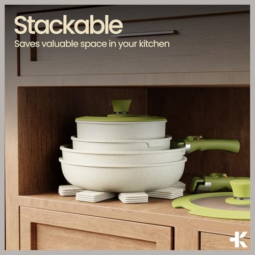 Specification: Pots and Pans Set Non Stick Ceramic-Granite – 15-Piece Cookware with Detachable Handles, Stackable Space-Saving, Dishwasher Safe, Stain-resistant, Oven & All-Stove Safe, Tempered Glass Lids, Green