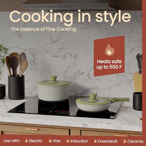 ALL-STOVE COMPATIBLE – This pots and pans works with gas, electric, ceramic, and induction stovetops. The see-through tempered glass lids with silicone rims let you monitor your food without losing moisture and flavor.
