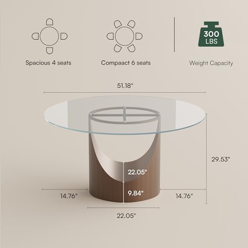 Specification: POVISON Round Dining Table for 4, 51″ Glass Tabletop Dining Table with Bronze Carbon Steel Pedestal, Modern Dining Room Table for Kitchen, Living Room (Table Only)
