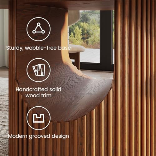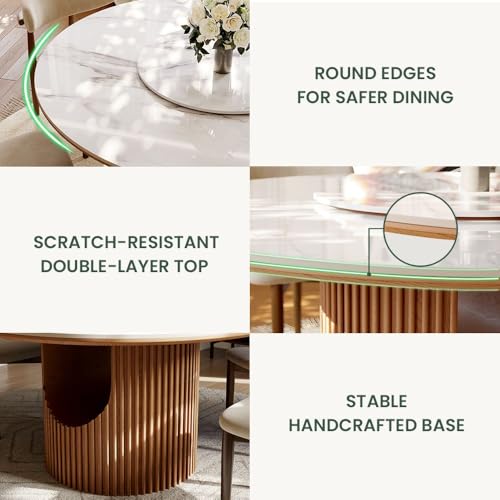 【Round Dining Table】: POVISON chic round dining table is equipped with 12mm glossy sintered stone tabletop, also with distinctive smile-like curved solid wood base design ensures stability, durability, and adds a stylish, modern touch to your dining space