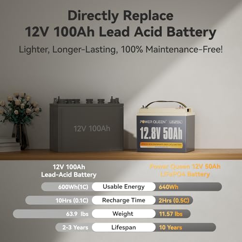 【Longer Usage Life: 10-Year】Power Queen LiFePO4 battery provides 4000+ cycles & a 10 years lifetime compared to 200 – 1000 cycles & a 3 years lifetime in typical Lead Acid batteries. Our lithium batteries can be fully charged without risk and maintain the capacity with low self-discharge rate, you can use the battery as you want even though put it aside for a long-time storage.