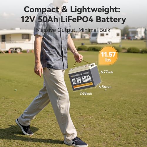 【Power Queen Upgraded 12.8V 50Ah Pro LiFePO4 Battery】Ultra portable and lightweight with size(LWH): 7.7 * 6.5 * 6.6 inches. Weight at only 11 LBS. The New 12.8V 50Ah Pro LFP battery has the handle as well for your convenience. The portable size fits in Group 24 /27/31 battery box perfectly.