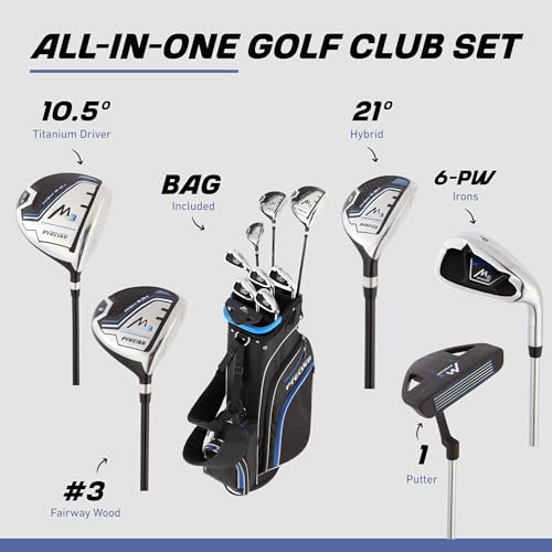 Perfect Your Golf Game with the Precise M3 Golf Club SetsDrive, putt, and swing like a pro with the Precise M3 men’s golf club set. Striking the perfect blend of distance, forgiveness, and convenience, our complete golf club sets are designed to help you play your best game, right out of the box.Your Ticket to Straighter, More Powerful ShotsEverything you need to hit the course with confidence comes with our men’s golf set. Hit powerful, long-distance shots with the cutting-edge driver, and experience ultimate precision and forgiveness on the woods. And for higher launches with more controlled distances, the hybrid is your go-to. 6-PW irons deliver exceptional forgiveness and enhanced feel, helping you hit more precise shots with greater control. Plus, the golf club set for men features a well-balanced putter with an alignment aid, helping sink more putts and finish strong on each hole. Finally, the golf sets for men right handed come with a deluxe dual-strap golf bag for comfortable carrying, featuring a grab handle and rain hood for added protection. Elevate Your Game with our Mens Golf Club Sets Right Handed:✓ Smash it off the tee with a powerful driver for maximum distance.✓ 6-PW irons provide precision and consistency, ideal for hitting fairways.✓ Sink more putts with a balanced, alignment-focused putter.✓ Aerodynamic woods make it a breeze to hit straighter shots.✓ Comes with a deluxe dual-strap bag and grab handle for effortless transportation.Tailored to Your SizeOur right handed golf clubs for men come available in regular, petite, and tall sizes, designed to fit golfers of all heights. With the perfect combination of distance and forgiveness, this set is designed to help golfers of all skill levels master their game.