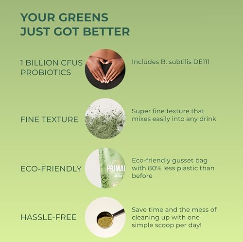 Specification: Primal Harvest Super Greens Powder, 30 Servings w/+50 Greens Superfood Chlorella, Probiotics, Green Tea, Wheatgrass, Kale, Turmeric for Energy,Primal Greens