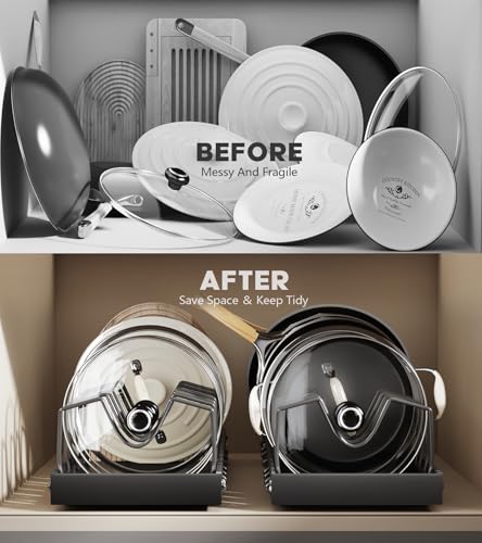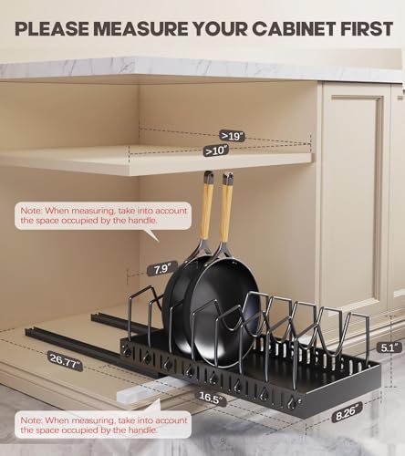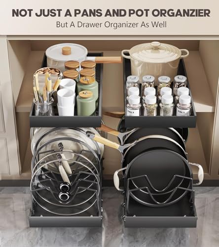 【Removable & Adjustable Dividers】: pots and pans organizer under cabinet is equipped with 10 dividers for lids, fry pan, cutting board, bakeware, skillet, baking sheet and more, and you can adjust the width of the storage according to the size of the pots and pans and lids, sliding lid holder and pan rack providing ample cabinet storage for all cookware and bakeware.