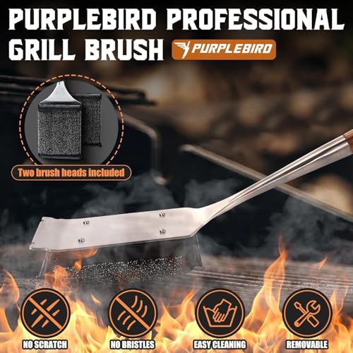 PURPLEBIRD Grill Brush Bristle Free for Outdoor Grill, 3 in 1 BBQ Brush with Scraper & Bottle Opener, Grills Cleaning Brushes with 1 Replacement Head, Grills Scrubber with Wood Handle