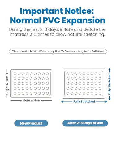 Normal PVC Expansion After 2-3 Days: During the initial inflation, the self inflating air mattress will stretch slightly. NOT leaks! This is a natural process, and the mattress will fully settle within 2-3 days. Re-inflate as needed to maintain ideal firmness