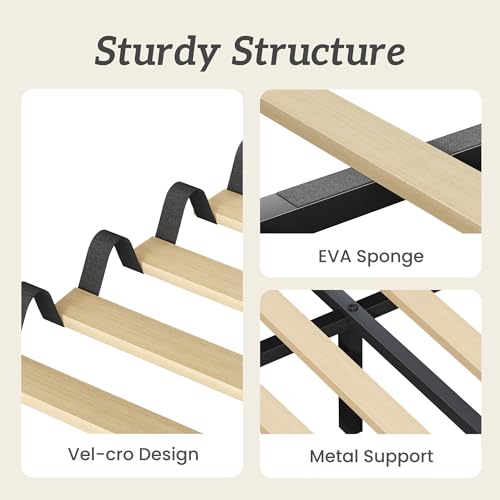 【Queen Bed Frame with Noise Free & No Box Spring Needed】 The slatted portion of this queen bed frame has a Velcro design that you can easily attach or detach. The entire middle of the queen size bed frame is constructed with a metal support system, which greatly enhances its stability. At the same time, the metal support beam in the middle of this queen size bed frame with headboard is equipped with EVA sponge, which reduces the squeaks that may occur during use and makes it as noise-free as possible. The overall structure of this queen bed frame with headboard already provides enough support to be used straight away and there is no box spring needed