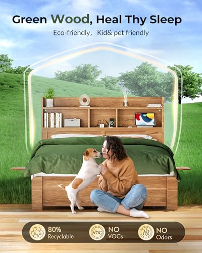 ✅ STORAGE HEADBOARD WITH CHARGING: 47.24″ tall storage headboard includes a 2-tier bookcase, foldable side tables, and a charging station (2 AC, 1 USB, 1 Type-C). The partitioned design neatly stores books, decor, and essentials, capable of charging an iPhone, laptop, iPad Air, and headphones simultaneously. This multifunctional queen size bed frame with storage offers more than sleep—it’s practical, functional, and keeps everything within reach