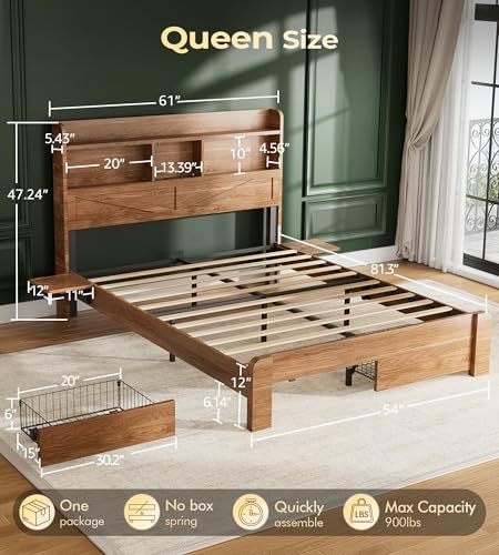 ✅ MAGNETIC UNDER-BED DRAWERS: This queen bed frame features two drawers (20″ x 10″ x 6″), hold 10-15 clothings, like T-shirts, dresses or sheets, pillows, toys, secured by a smooth magnetic closure—no accidental openings or toe stubs like traditional hook-based designs. Plus, the 6-inch under-bed space fits storage basket or seasonal items. Maximize your bedroom storage and keep organized, stylish and tidy