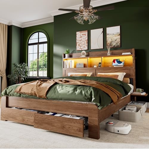 Specification: Queen Bed Frame with 2-Tier Storage Headboard, LED Lights, Charging Station, 2 Drawers, 900lbs Capacity, Wood & Metal Platform, Noise-Free, No Box Spring Needed, Barn Door Design